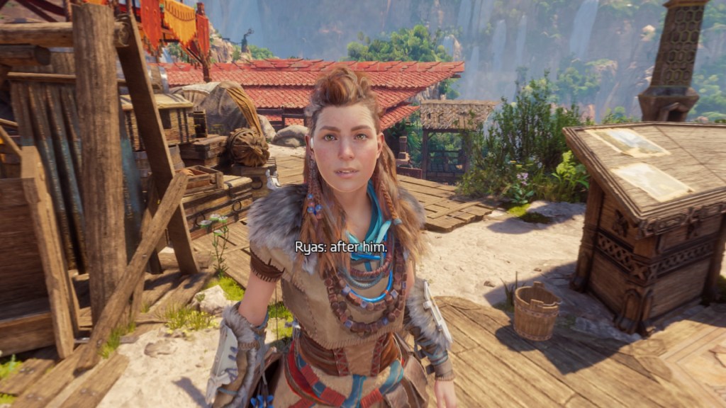 The first thing that struck me was the gorgeous and sharp visuals. The game starts of you being on a boat ride and then some robots attack and capsizes the boat. You play as Ryas, a former Shadow Carja rebel, who is sentenced to atone for his crimes by joining an expedition sent to investigate a new threat to the Sundom. This means you need to climb obstacles and mountains to reach your destination, also defeat enemy robots.