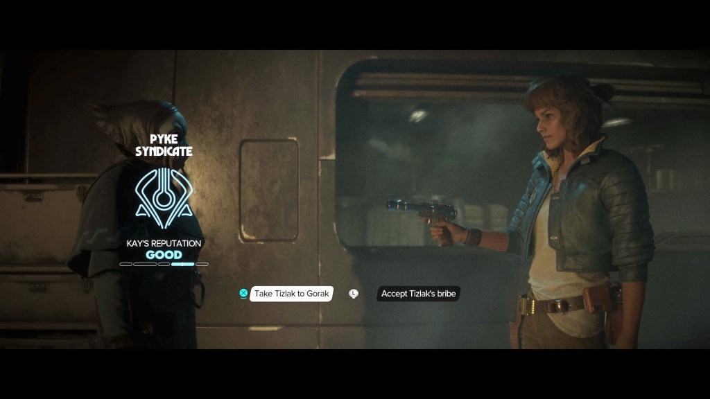 The gameplay in Star Wars Outlaws was a quintessential open world game. Kay has to do odd jobs and deals to survive in the rough life. There are the main quests, but also side quests. I played the game in an order of first going through the main story then I took my time and went back to do the side missions. Not all of them, but some of them. What helps going quickly between settlemens and cities was the speeder vehicle, and sometimes you’ll get attacked by enemies on your way through vast plains and roads. The other vehicle is a spaceship that’ll take you to other planets and there are also some space battles which were gripping, but short-lived experiences.