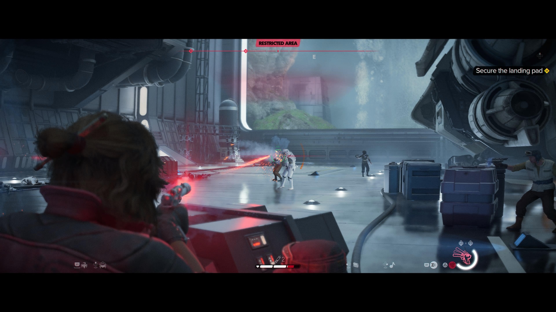 Kay got one gun with her, Blaster, and she can use other guns in certain areas only (after killed enemy had dropped it), but those guns cannot be carried out of the area. She also has other things like grenades and after upgrading the Blaster it gets more powerful. Some enemies could be killed easily, some needed much bigger impact. I found the gun to be somewhat inaccurate, like Stormtroopers in the movies. Also Nix can be used in battle to do certain little tasks like distract, attack and steal. Kay also does a lot of plaforming to get to places.